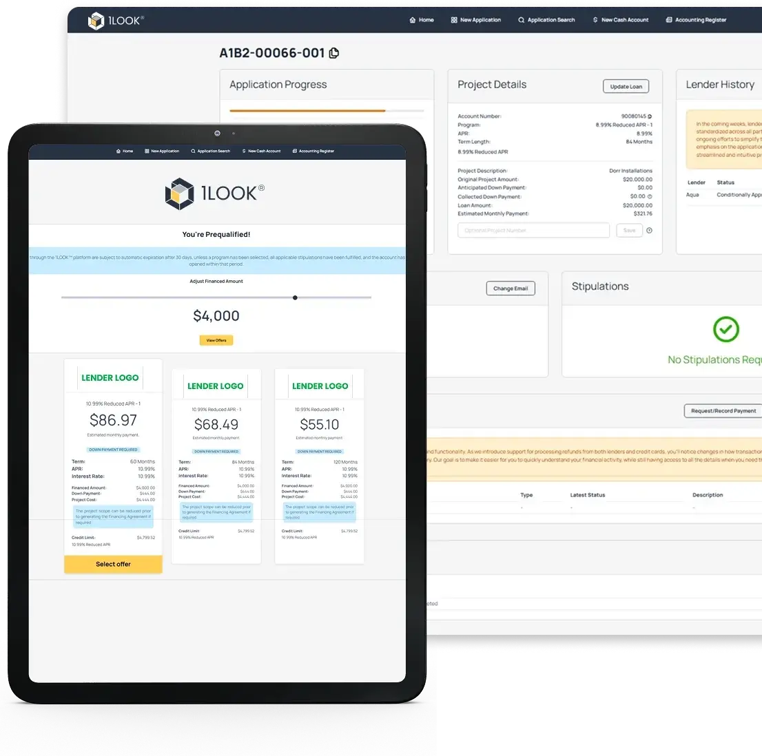 1LOOK® is customer financing software built by home improvement experts for home improvement experts. It connects your team to multiple top lenders through one simple application and matches each customer to the lender most likely to approve and fund. You also get real-time support, expert coaching, and tools that help your reps close more jobs without slowing down the sale.